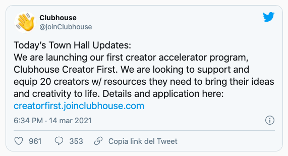 La cosa più importante è sicuramente il lancio del progetto Clubhouse Creator First, che consentirà a 20 creatori di contenuti di Clubhouse di ottenere materiali e strumenti per proseguire il proprio lavoro. Naturalmente verranno selezionati i progetti più innovativi, non importa di che settore, e che siano in corso di sviluppo anche su piattaforme social diverse, come TikTok, Instagram, Twitter, Youtube e Twitch.