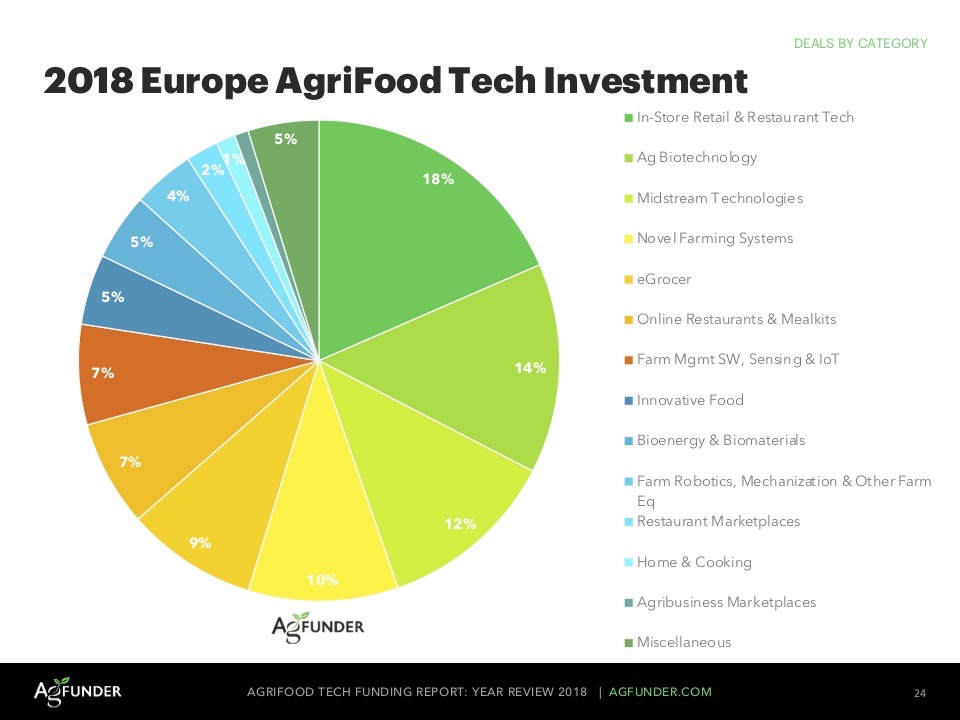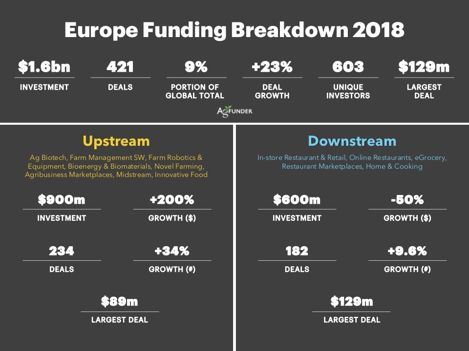 Ancora più degno di nota, sottolineano gli estensori del report, è l’incremento del 200% dei finanziamenti alle startup upstream, quelle che operano più vicino alla azienda agricola o nella supply chain prima del rivenditore. Benché i rapporti potrebbero essere leggermente migliorati nel 2018 a causa delle nuove partnership sui dati, evidenzia AgFunder, non vi è dubbio che a monte l’innovazione stia rapidamente prendendo piede in Europa, in particolare nei software e nelle tecnologie di rilevamento agricoli, nonché nella robotica e nei nuovi sistemi di allevamento. Gli investimenti a valle, in particolare nel food delivery, si sono ridotti del 50% poiché diverse start-up della categoria sono uscite tramite IPO e M&A.