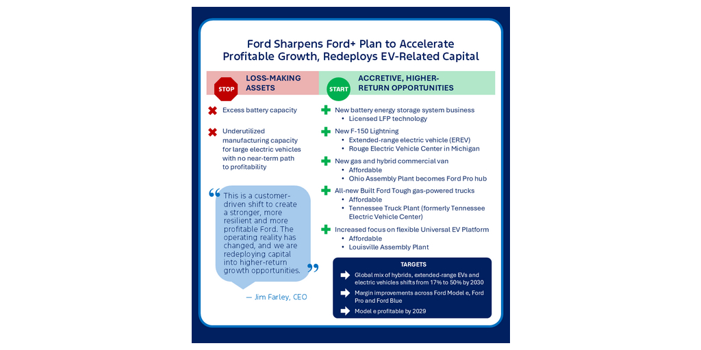 “This is a customer-driven shift to create a stronger, more resilient and more profitable Ford,” said Ford president and CEO Jim Farley. “The operating reality has changed, and we are redeploying capital into higher-return growth opportunities: Ford Pro, our market-leading trucks and vans, hybrids and high-margin opportunities like our new battery energy storage business.”