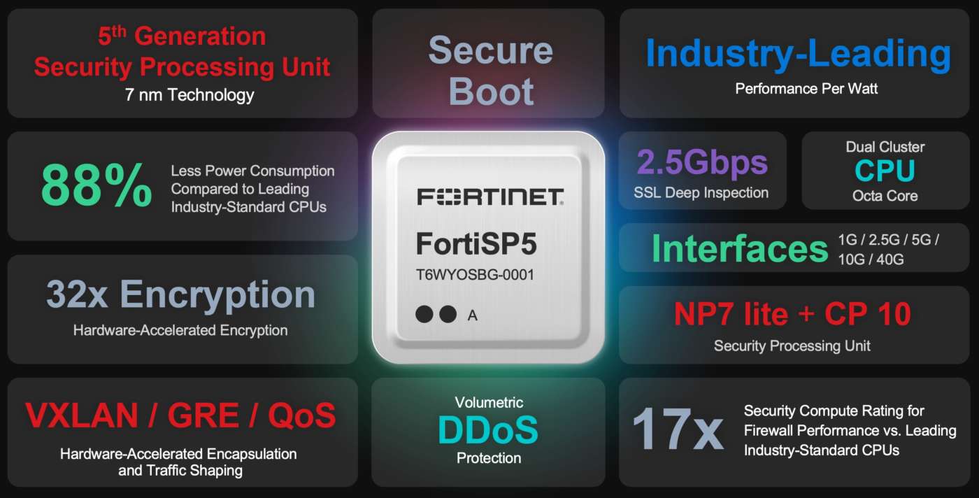 Essendo un chip a 7 nanometri di quinta generazione, FortiSP5 racchiude più funzionalità in un fattore di forma più piccolo per garantire: