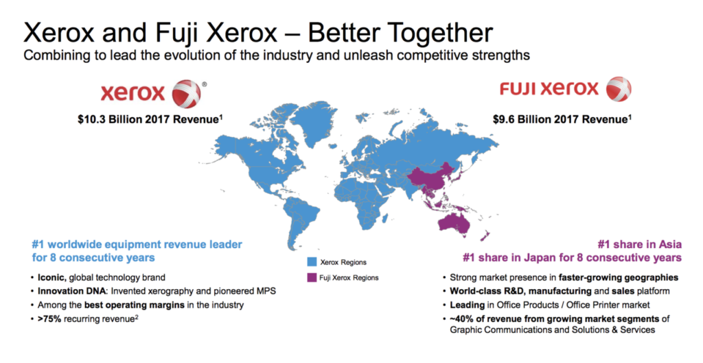 Per l’amministratore delegato di Xerox, Jeff Jacobson, “La combinazione proposta ha una logica industriale convincente e sbloccherà significative opportunità di crescita e produttività per l’azienda combinata, fornendo al contempo un valore sostanziale agli azionisti. La nuova società sarà meglio posizionata per competere nell’ambiente odierno con una dimensione veramente globale, una maggiore presenza nei mercati in rapida crescita e capacità di innovazione per soddisfare efficacemente le esigenze in rapida evoluzione dei nostri clienti“.