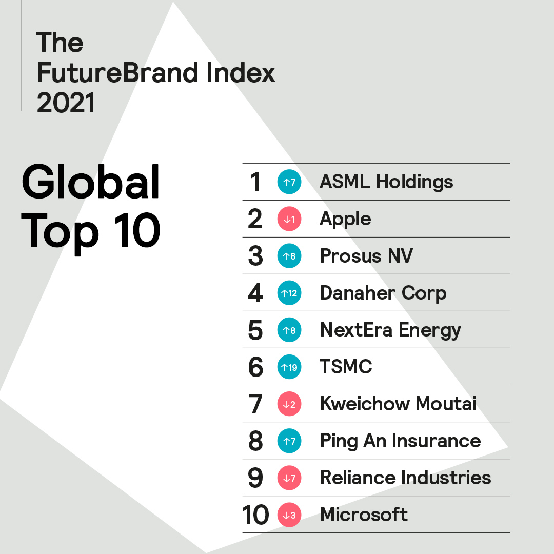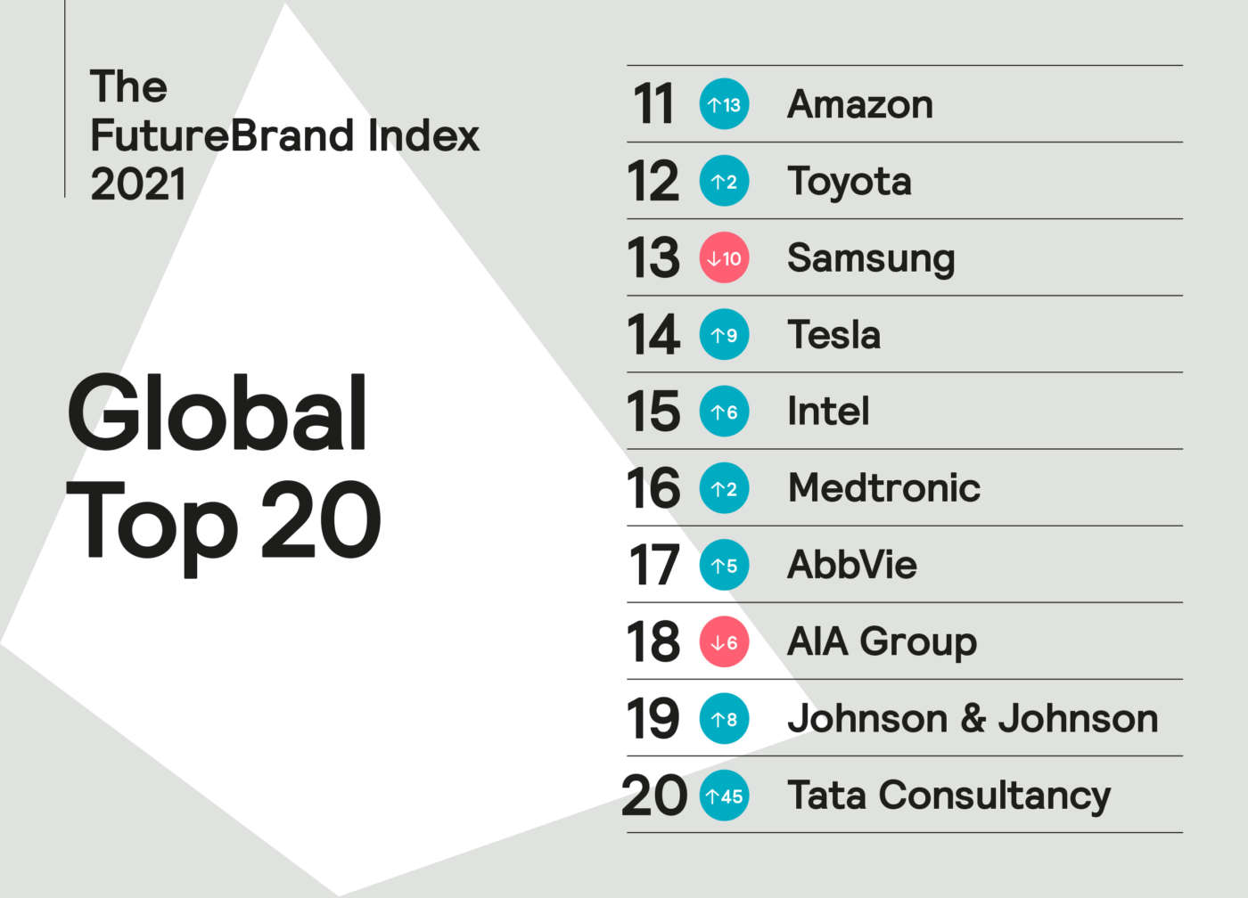 Il FutureBrand Index è uno studio sulla percezione globale che riordina le prime 100 aziende per capitalizzazione di mercato di PwC in base alla forza della loro percezione piuttosto che alla loro forza finanziaria. Utilizzando 18 indicatori che, in base all’esperienza di FutureBrand, forniscono i segnali di successo più rilevanti (tra cui “purpose” ed “experience”), la classifica è determinata da parametri precisi. La ricerca di quest’anno ha avuto luogo tra il 27 aprile e il 12 maggio 2021.