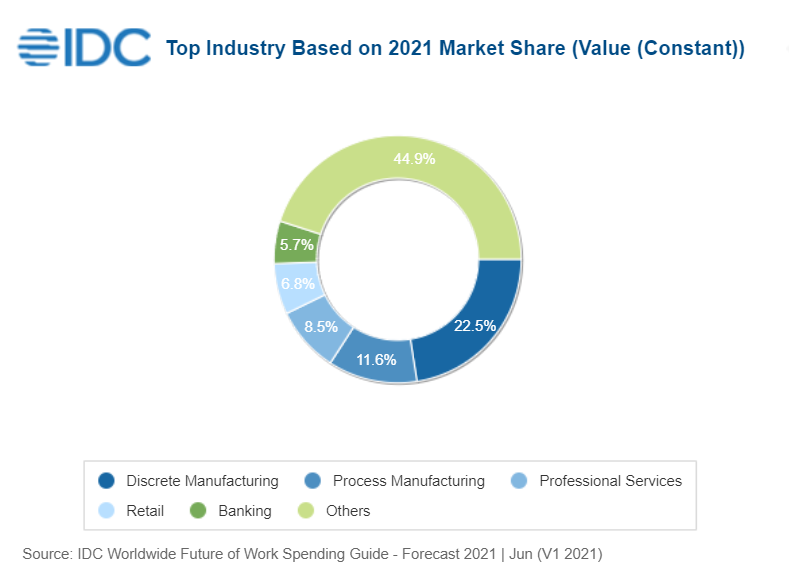 Insieme, il discrete e il process manufacturing rappresenteranno poco più di un terzo di tutta la spesa in Future of Work di quest’anno.