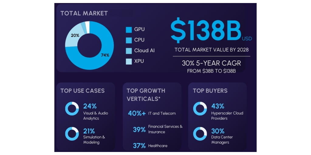 • According to the study, the market’s evolution indicates that CPUs have been, and will continue to hold an important role in AI processing in data centers, holding 20% market share when entering 2024, and will see a 28% 5-year CAGR – growing from $7.7B to $26B by 2028