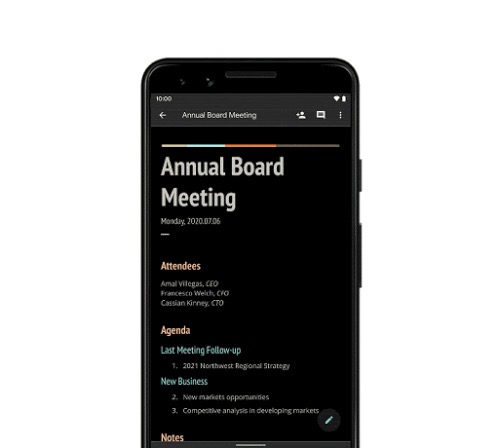 Innanzitutto, la nuova release porta in Documenti, Fogli e Presentazioni Google della G Suite su Android il supporto per il tema scuro, il dark theme.