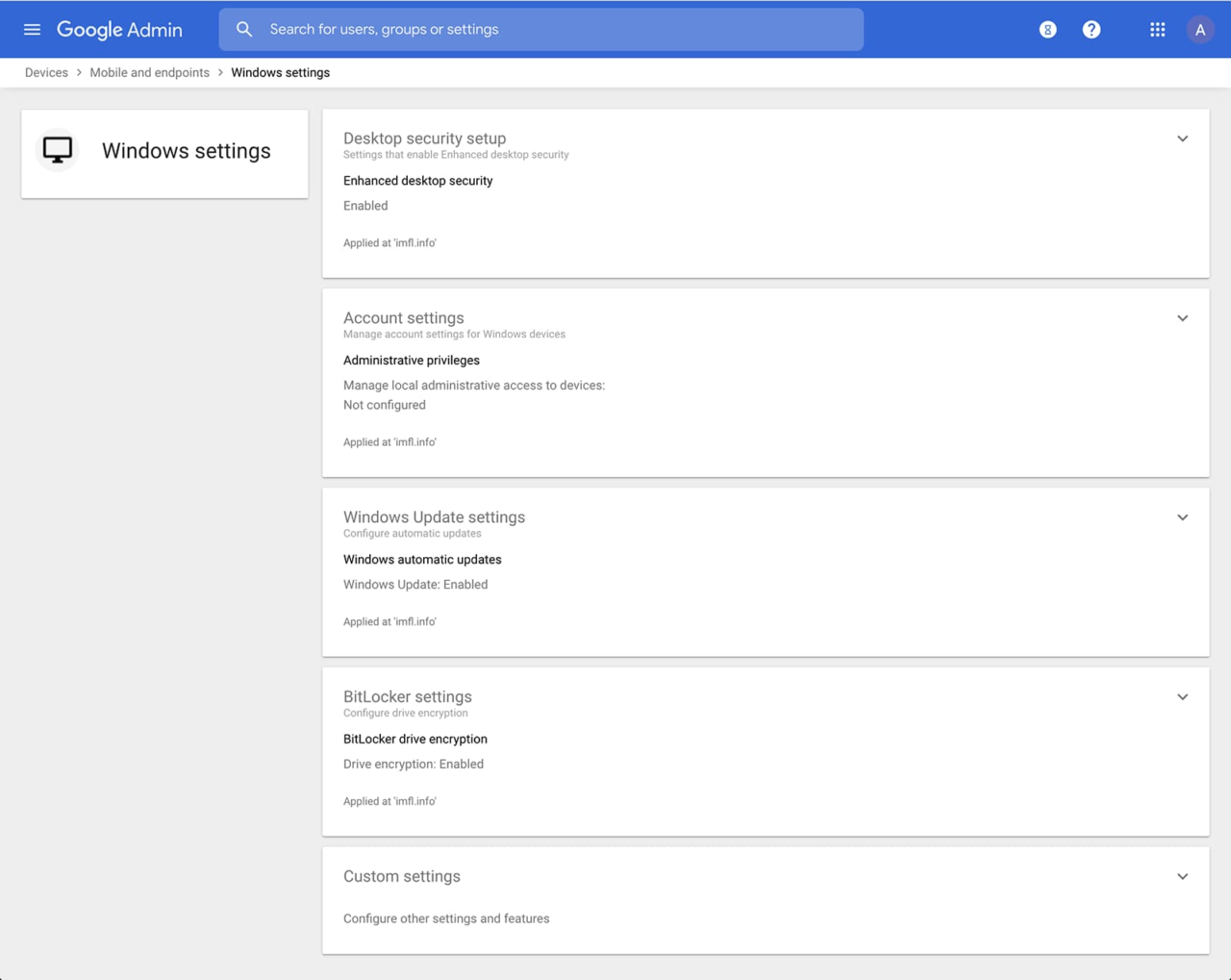 Gli amministratori possono anche gestire e proteggere i dispositivi desktop con una gestione fondamentale dei dispositivi e una sicurezza desktop avanzata per Windows . Con la gestione fondamentale dei dispositivi, quando un utente accede alla G Suite tramite browser su un dispositivo Windows, Mac, Chrome o Linux, quel dispositivo verrà automaticamente registrato con la gestione degli endpoint. Questo fornisce un livello base di sicurezza a ogni dispositivo desktop che accede ai dati di G Suite. Con la sicurezza desktop avanzata per Windows, gli amministratori possono gestire e proteggere i dispositivi Windows 10 tramite la console di amministrazione.
