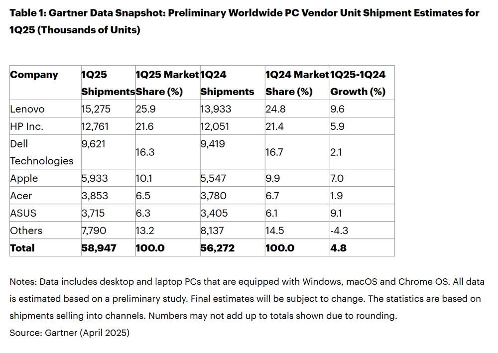 Secondo i risultati preliminari di Gartner, le spedizioni di PC a livello mondiale hanno totalizzato 59 milioni di unità nel primo trimestre del 2025, con un aumento del 4,8% rispetto al primo trimestre del 2024. Le spedizioni di PC negli Stati Uniti sono cresciute del 12,6%, raggiungendo 16 milioni di unità nel primo trimestre del 2025.