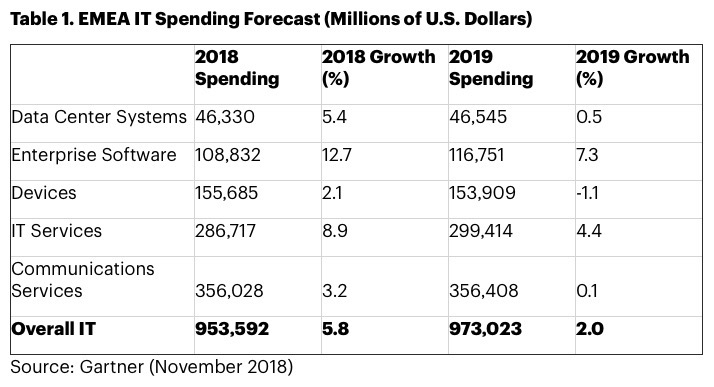 Gartner prevede, per la spesa IT in Emea, un totale 973 miliardi di dollari nel 2019. Con un aumento del 2% rispetto alla spesa stimata di 954 miliardi di dollari nel 2018, sempre secondo le ultime previsioni della società di ricerca.