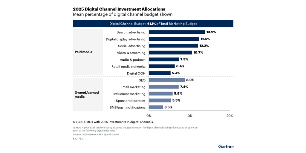 The annual Gartner 2025 CMO Spend Survey of 402 CMOs and other marketing leaders in North America, the United Kingdom and Europe between February and March 2025 found that paid online channels lead the digital mix, accounting for 69% of total digital spend (see Figure 1).