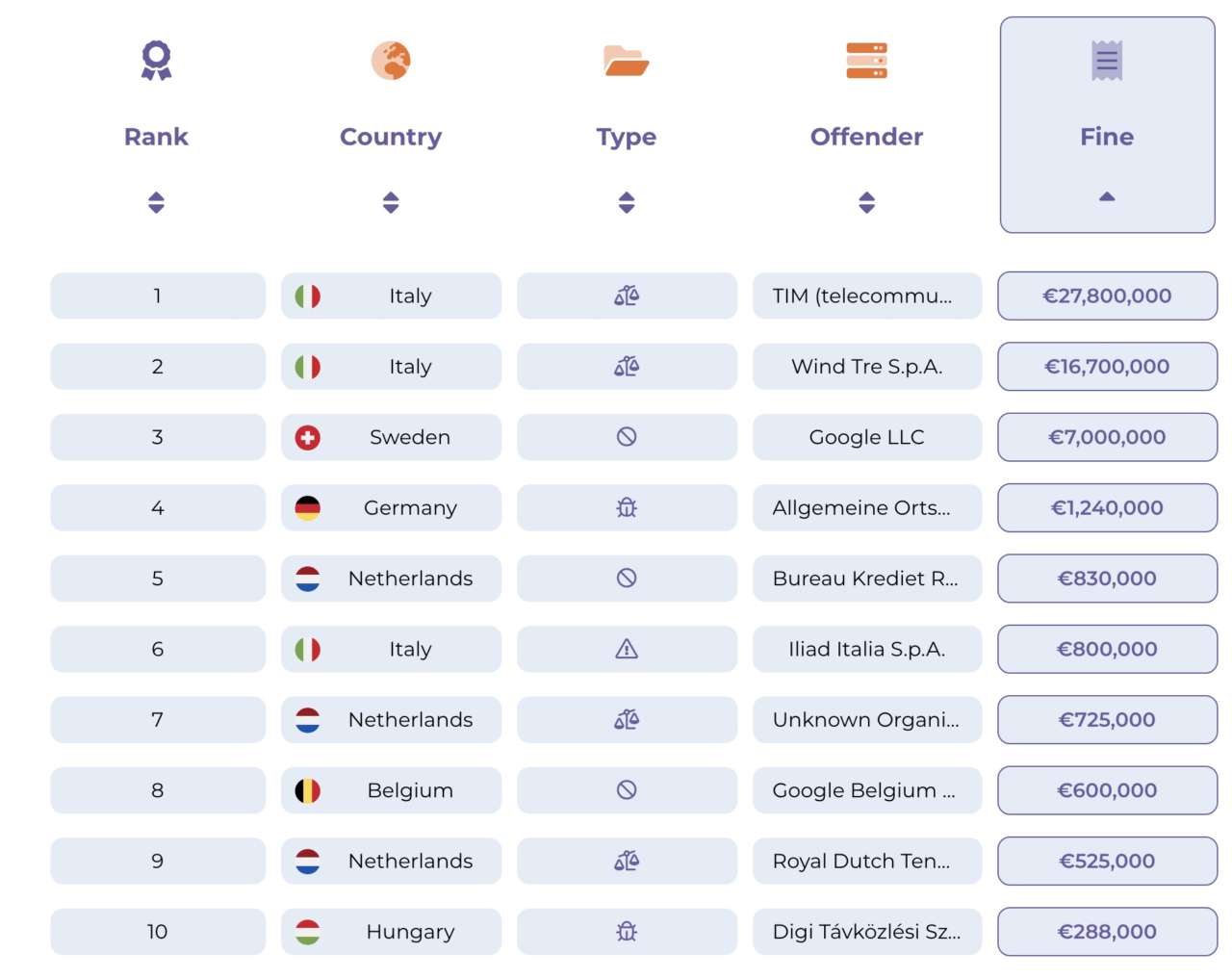 Scorrendo il database di Enforcement Tracker scopriamo che le sanzioni più rilevanti in termini di valore finanziario elevate dal Garante italiano sono quelle riguardanti gli operatori di tlc (Tim, Wind tre e Iliad), ma sono coinvolte anche società per azioni, utilty, enti pubblici e financo partiti politici, come il Movimento 5 Stelle.