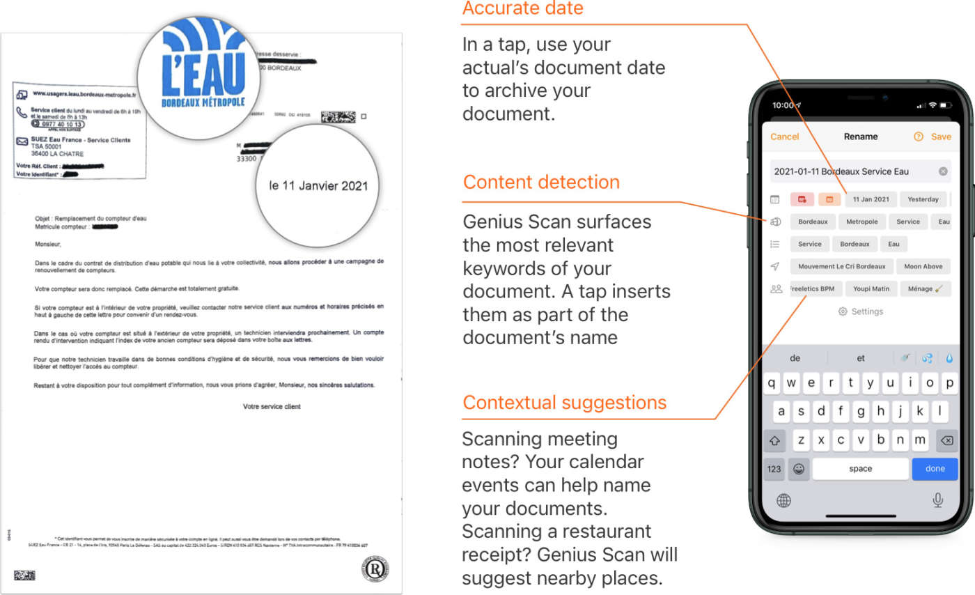 Nella versione per iOS il team di  sviluppo ha anche aggiunto la nuova funzione Smart Document Renaming, che aiuta a rinominare i documenti in modo facile e veloce. Genius Scan esamina il contenuto del documento scansionato e i pattern dei nomi dei documenti esistenti per fornire suggerimenti intelligenti per il nome del nuovo documento. La ridenominazione smart dei documenti rileva anche la data effettiva del documento, piuttosto che la data in cui si sta effettuando la scansione.