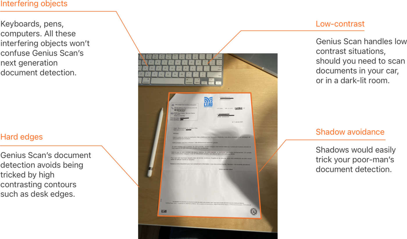 I nuovi algoritmi basati sul deep learning alimentano ora la funzione di rilevamento dei documenti. Grazie a questo, il nuovo aggiornamento fa sì che Genius Scan metta subito a fuoco i documenti, anche nelle configurazioni più difficili: ad esempio con un foglio di carta bianca su una scrivania bianca o con una tastiera del computer che entra nell’inquadratura. Il rilevamento del documento è quindi più preciso e accurato, ma anche molto più veloce, assicura lo sviluppatore.