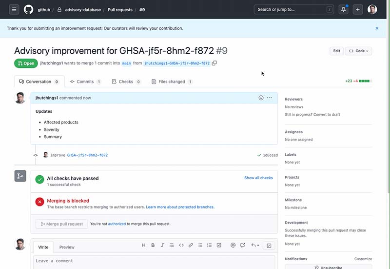 Per completare un invio, un form guida attraverso l’apertura di una pull request che dettaglia le modifiche suggerite. Una volta che la pull request è aperta, i ricercatori di sicurezza del GitHub Security Lab, così come il manutentore del progetto che ha presentato il CVE (se noto), saranno in grado di rivederla.