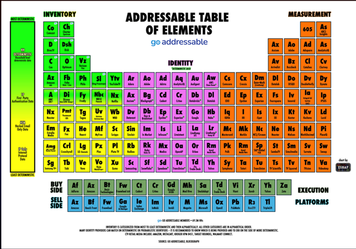 In partnership with Evan Shapīro, Go Addressable debuts the innovative Addressable Table of Elements, illustrating the extensive number of companies that support the 69.5 million unduplicated households across the Go Addressable footprint. The below table showcases the wide variety of addressable inventory sources, highlighting superior offerings for those using deterministic data.