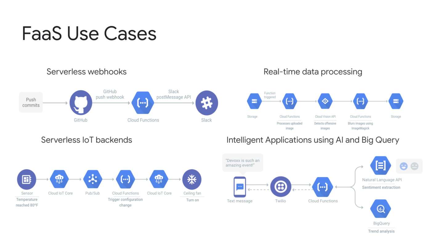 Oppure per sistemi di elaborazione dati in tempo reale, come il processing dei file mentre vengono caricati su Cloud Storage, per gestire stream di eventi in tempo reale da Pub/Sub; oppure, ancora, per applicazioni intelligenti quali assistenti virtuali e chat bot, o eseguire analisi di video, immagini o sentiment.