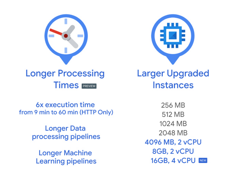 Cloud Functions aggiunge una serie di nuove funzionalità, come la concorrenza (fino a 1.000 richieste concorrenti per istanza di funzione), istanze più grandi (16 GB di memoria e 4 vCPU), tempi di elaborazione più lunghi per le funzioni HTTP (fino a 60 minuti) e istanze minime (prewarmed).