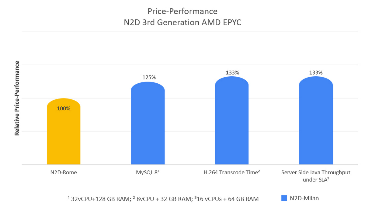 Le macchine virtuali N2D potenziate dai processori Amd Epyc di terza generazione offrono, in media, oltre il 30% di miglioramento delle prestazioni in una varietà di carichi di lavoro rispetto ai precedenti processori Amd Epyc di seconda generazione, ha affermato Google Cloud.