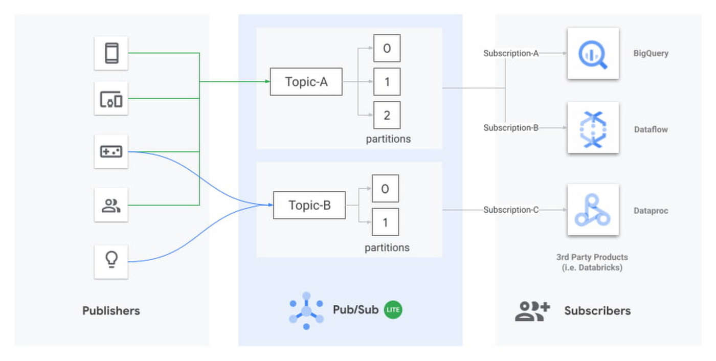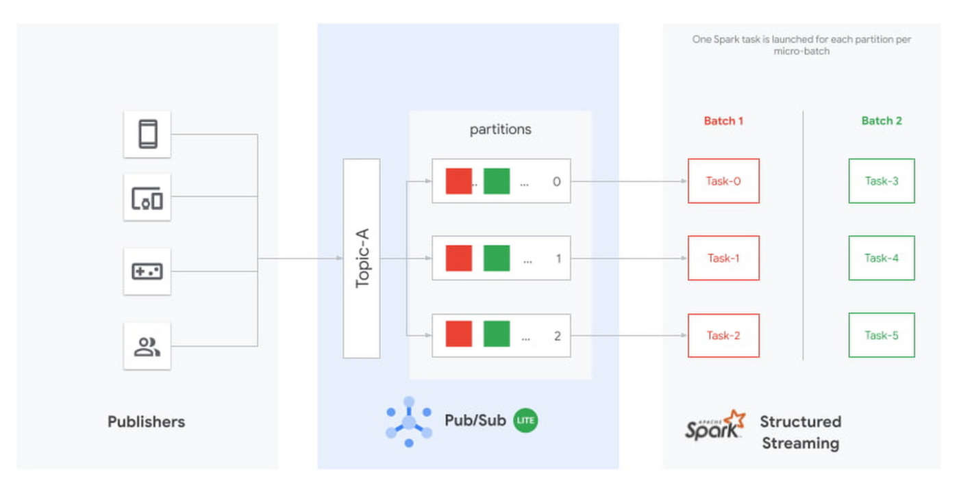 Il servizio di messaging Pub/Sub Lite è stato rilasciato di recente: è scalabile orizzontalmente e permette di inviare e ricevere messaggi in modo asincrono tra applicazioni indipendenti. Le applicazioni publisher pubblicano messaggi su un topic Pub/Sub Lite, e le applicazioni subscriber (come Apache Spark) leggono i messaggi dal topic.