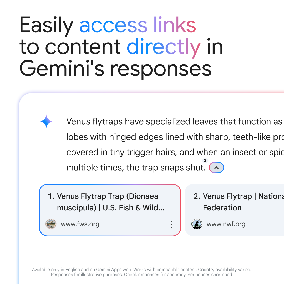 Un’altra novità annunciata da Google è che, a partire da oggi, per le richieste in lingua inglese in alcuni Paesi, gli utenti potranno accedere a informazioni aggiuntive sugli argomenti di loro interesse direttamente nelle risposte di Gemini. Basta fare clic sulla freccetta sotto il paragrafo per visualizzare i siti web in cui è possibile approfondire un determinato argomento. Ciò non è limitato ai siti web: se la risposta di Gemini fa riferimento a informazioni trovate utilizzando l’estensione Gmail, sarà possibile vedere anche collegamenti in linea alle e-mail pertinenti.