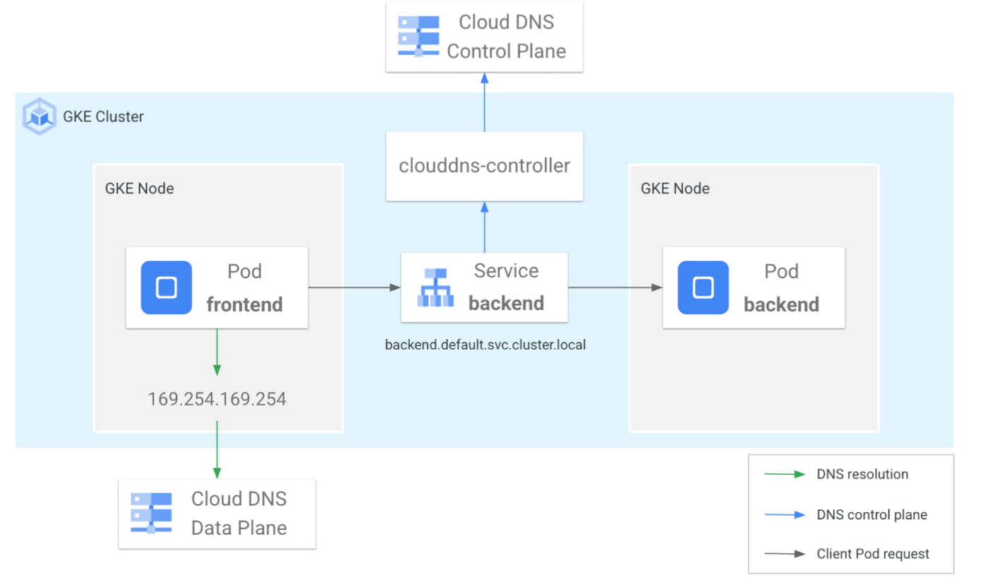 Con Cloud DNS, ogni nuovo servizio crea un record DNS che può essere risolto localmente sul nodo GKE utilizzando il dataplane Cloud DNS. Il caching e la risoluzione locale di Cloud DNS garantiscono che le richieste DNS non debbano attraversare la rete, migliorando drasticamente le prestazioni.