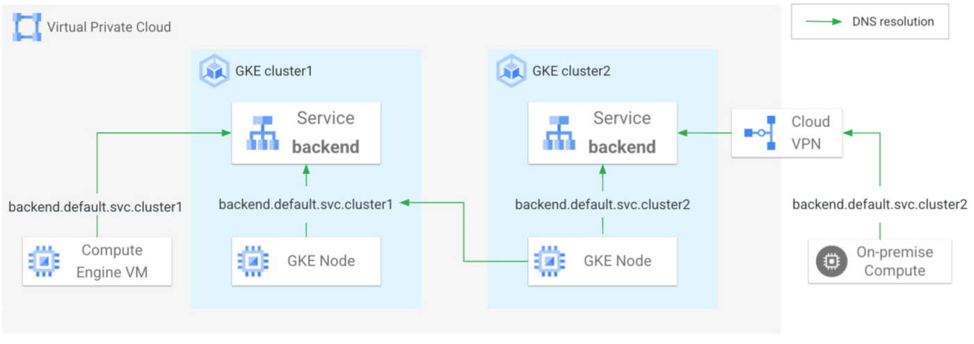 VPC-scope DNS crea un unico dominio di service discovery su tutti i cluster GKE e i client della rete. Questo rilevamento dei servizi senza soluzione di continuità è completamente automatico e può essere facilmente abilitato su una base per cluster.