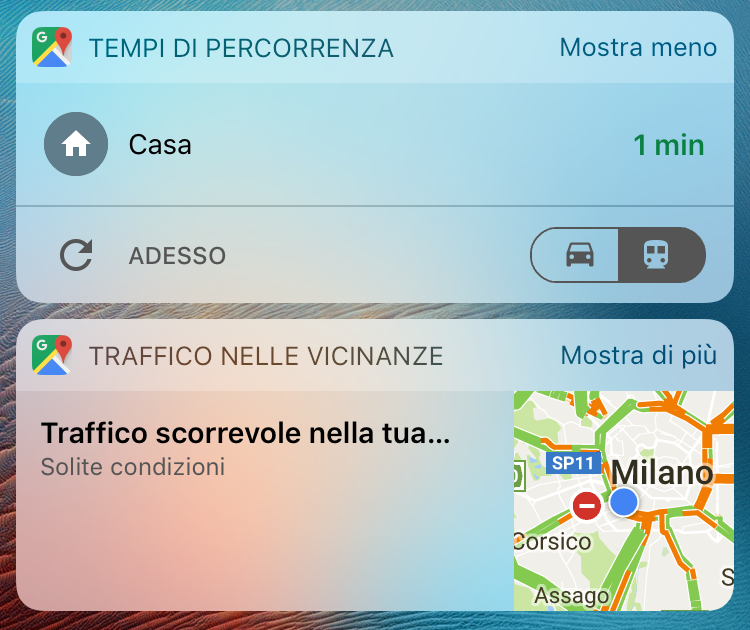 La seconda utile aggiunta a Google Maps è il widget Traffico nelle vicinanze per la schermata Oggi. Mostra una piccola mappa della zona intorno al punto in cui ci troviamo, con una indicazione dei flussi di traffico in tempo reale e una valutazione generica come “traffico scorrevole“.