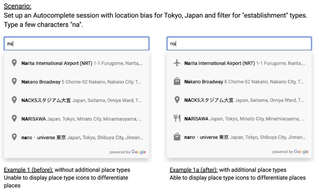 Affinché gli utenti possano discernere meglio tra punti di interesse simili, Google ha esteso Autocomplete perché restituisca ora tutti i tipi di luoghi applicabili. Quindi Autocomplete ora restituisce tipi aggiuntivi quali ristoranti, assistenza sanitaria, luoghi di culto, istituti finanziari e altro ancora.