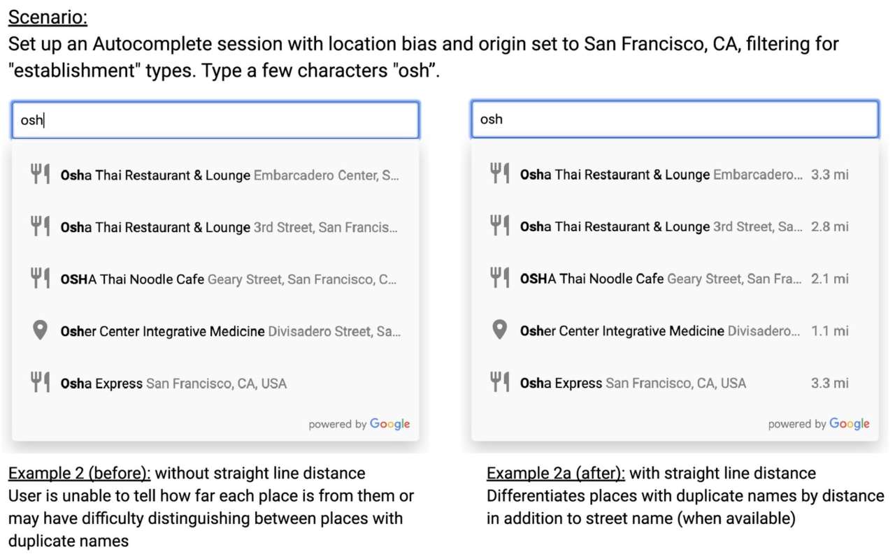 Inoltre, spiega ancora Google, potrebbe capitare che un utente che visiti il centro di una città e desideri trovare una caffetteria, ottenga diversi locali con lo stesso nome, nell’area di ricerca. Anche in questo caso, per consentire ai siti di offrire una user experience migliore, l’azienda ha sviluppato un nuovo campo di Completamento automatico che fornisce la distanza in linea retta tra i punti di interesse e una posizione selezionata dall’utente.