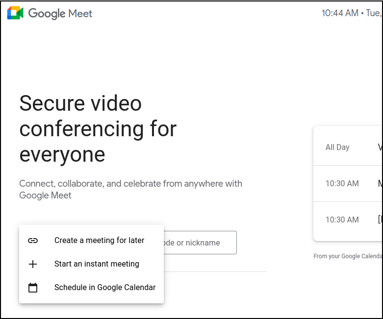 Infine, la terza opzione è Pianifica in Google Calendar: questa porta a Calendar in una nuova scheda per creare un evento con i dettagli della riunione di Google Meet compilati automaticamente.