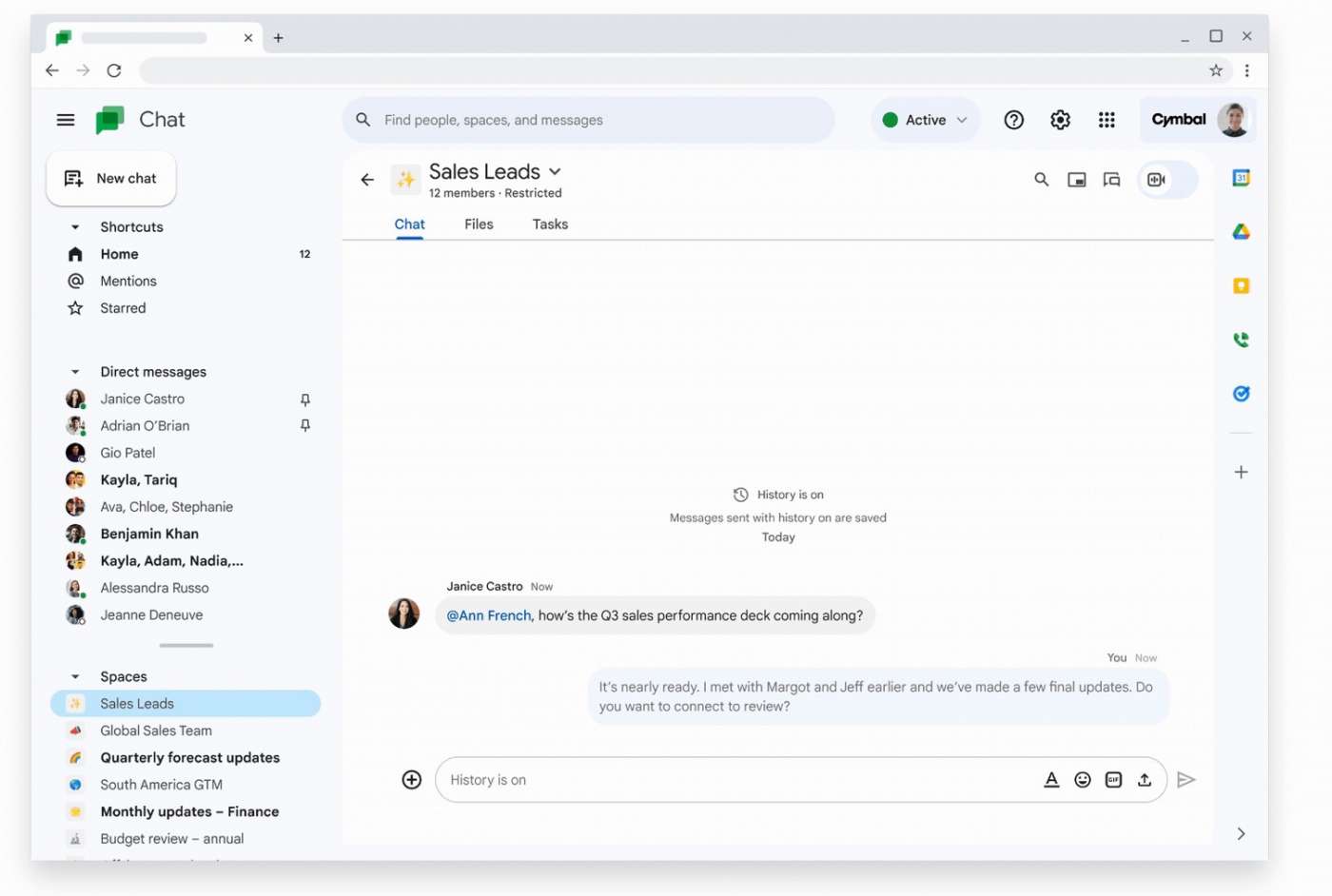 Non tutte le conversazioni richiedono una riunione e a volte la collaborazione avviene in movimento. Si potrebbe aver bisogno di una chat veloce per connettersi con il proprio team o per risolvere un problema. Google Chat ora rende tutto molto più semplice grazie a un’interfaccia utente rinnovata, a nuove scorciatoie e a una ricerca migliorata che consentono di tenere sotto controllo le conversazioni. È inoltre possibile chattare direttamente con Duet AI per porre domande sui contenuti, ottenere un riepilogo dei documenti condivisi in uno spazio e recuperare le conversazioni perse.