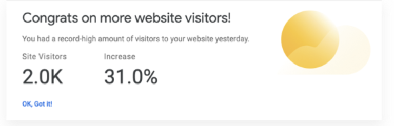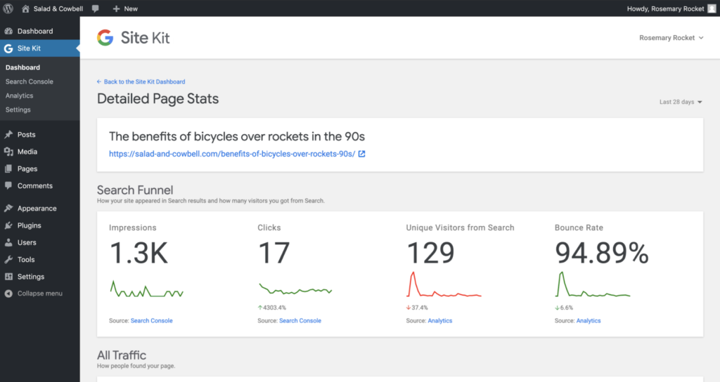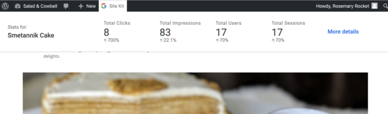 È poi possibile controllare come sta andando una pagina specifica, restringendo e analizzando le statistiche solo per quella pagina. Quando si è loggati, è possibile visualizzare le statistiche principali del sito anche direttamente nella admin bar. Il plug-in di Google Site Kit ci tiene inoltre informati sui progressi ottenuti, in termini di più visualizzazioni, più visitatori o altri risultati raggiunti riguardanti il sito web.