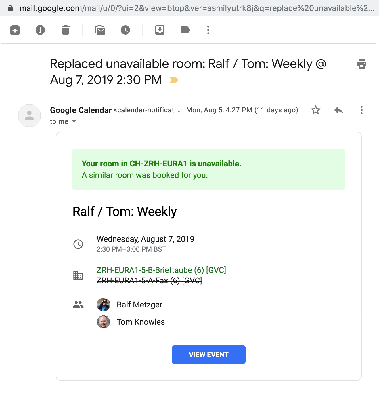 C’è una novità anche per Google Calendar. In passato, quando una room rifiutava una riunione di Calendar, gli utenti potevano non accorgersene fino all’ultimo minuto, lasciando tutti senza una sala. Una nuova funzione fa ora sì, se attivata, che Calendar cerchi automaticamente di trovare e prenotare una sala sostitutiva di dimensioni simili, nello stesso edificio e con le stesse attrezzature.
