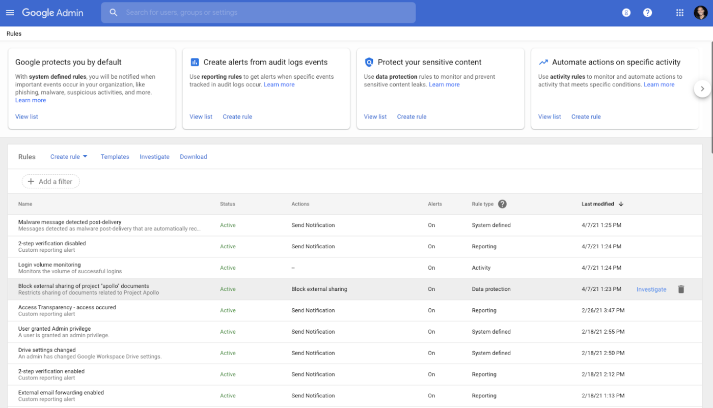 Poi, gli ultimi rilasci di Google Workspace hanno introdotto una pagina di template di regole, disponibile per i clienti Enterprise Standard ed Enterprise Plus, che aiuta a impostare rapidamente le regole per i casi d’uso più comuni.