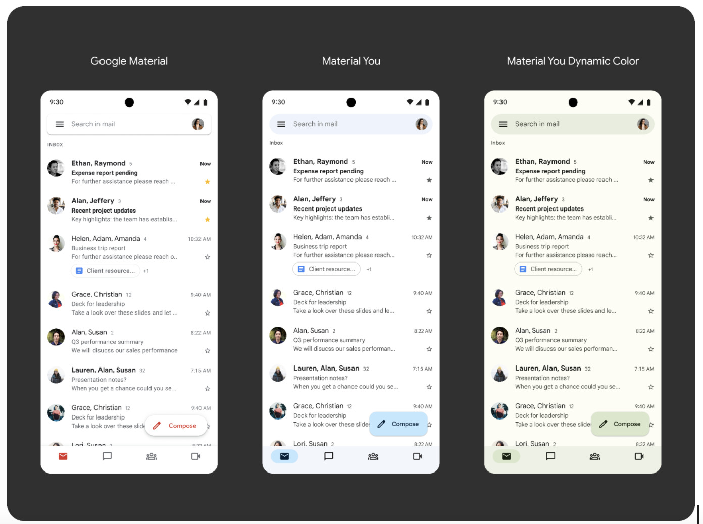 Tra i cambiamenti che gli utenti potranno notare ci sono le barre di navigazione aggiornate, pulsanti d’azione fluttuanti migliorati e l’uso del testo Google Sans per una migliore leggibilità nelle dimensioni dei caratteri più piccole.