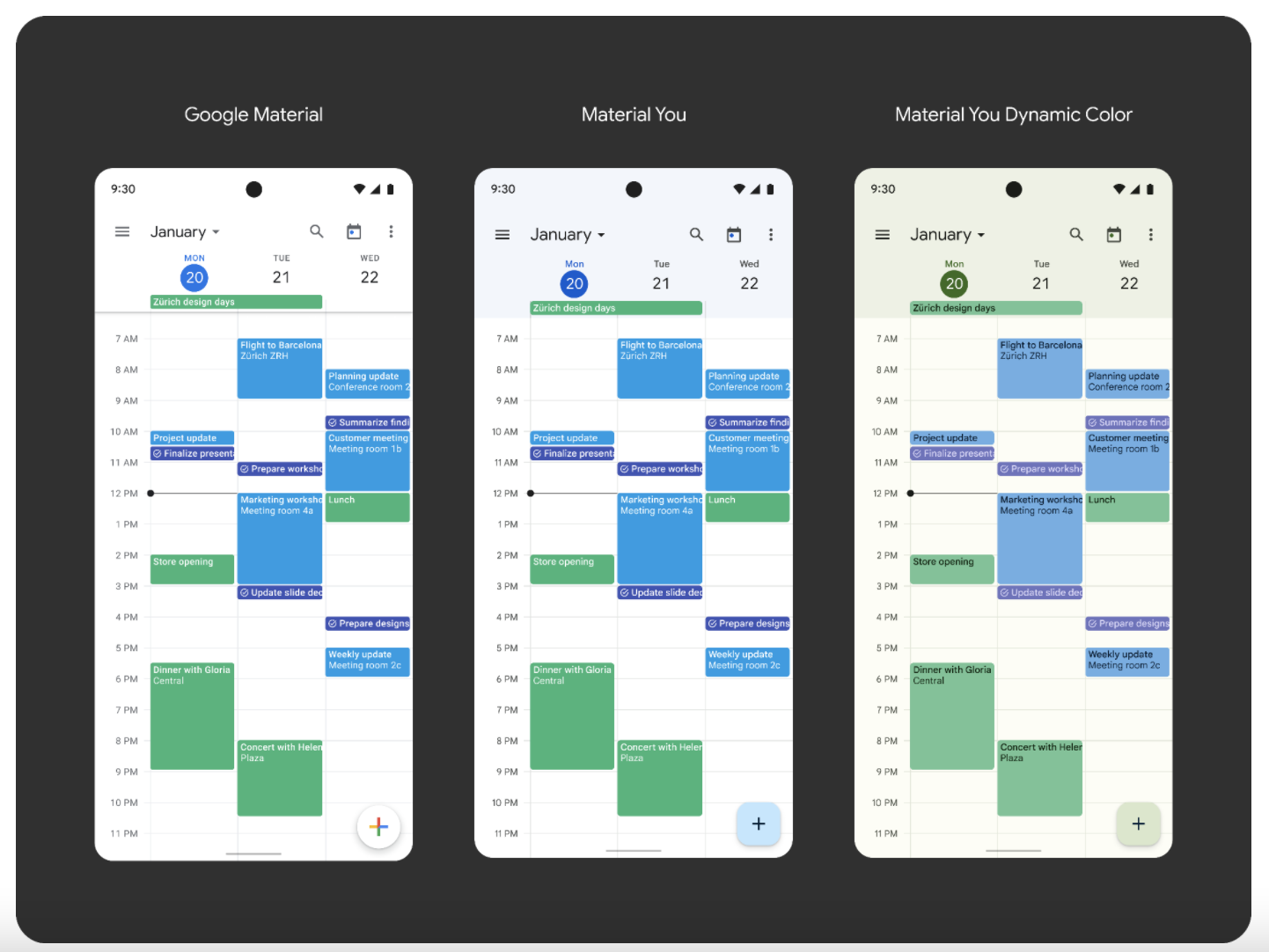 Per espandere il supporto all’accessibilità esistente, ha poi sottolineato Google, Material You regolerà automaticamente il contrasto, la dimensione e la larghezza delle linee in base alle preferenze dell’utente e al contesto dell’app. Gli schemi di colore preesistenti, per esempio i tipi di file codificati a colori, i colori delle cartelle, o per gli avvisi in-app, rimarranno invariati.