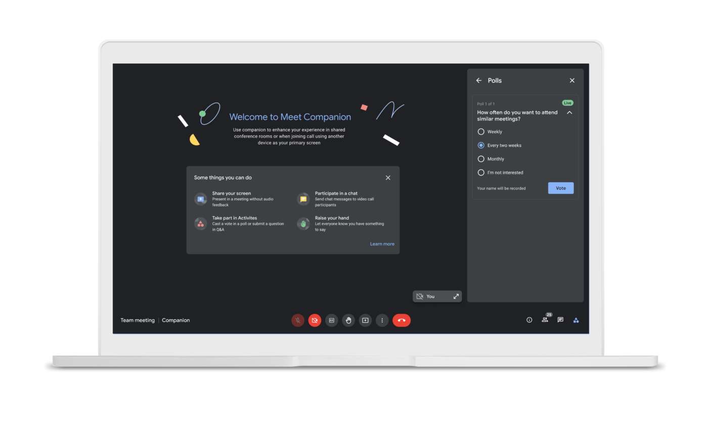 Companion Mode su Google Meet. Companion Mode consente a ciascun partecipante al meeting un accesso a feature interattive e strumenti di controllo. Ad esempio sondaggi, in-meeting chat, alzate di mano, Q&A, sottotitoli live e altro ancora.