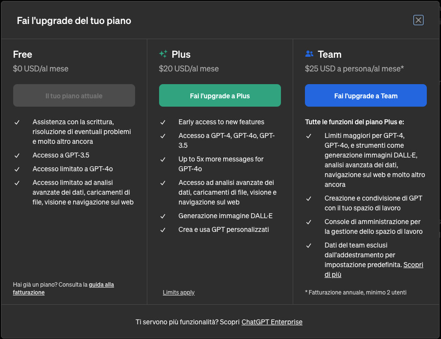 Al momento in cui scriviamo (il 14 maggio 2024) gli utenti Plus possono inviare fino a 80 messaggi ogni 3 ore con GPT-4o e fino a 40 messaggi ogni 3 ore con GPT-4, ma il limite potrebbe ridursi durante le ore di punta. Inoltre, il limite di messaggi di GPT-4 e GPT-4o per un utente in uno spazio di lavoro ChatGPT Team è più alto di quello di ChatGPT Plus.