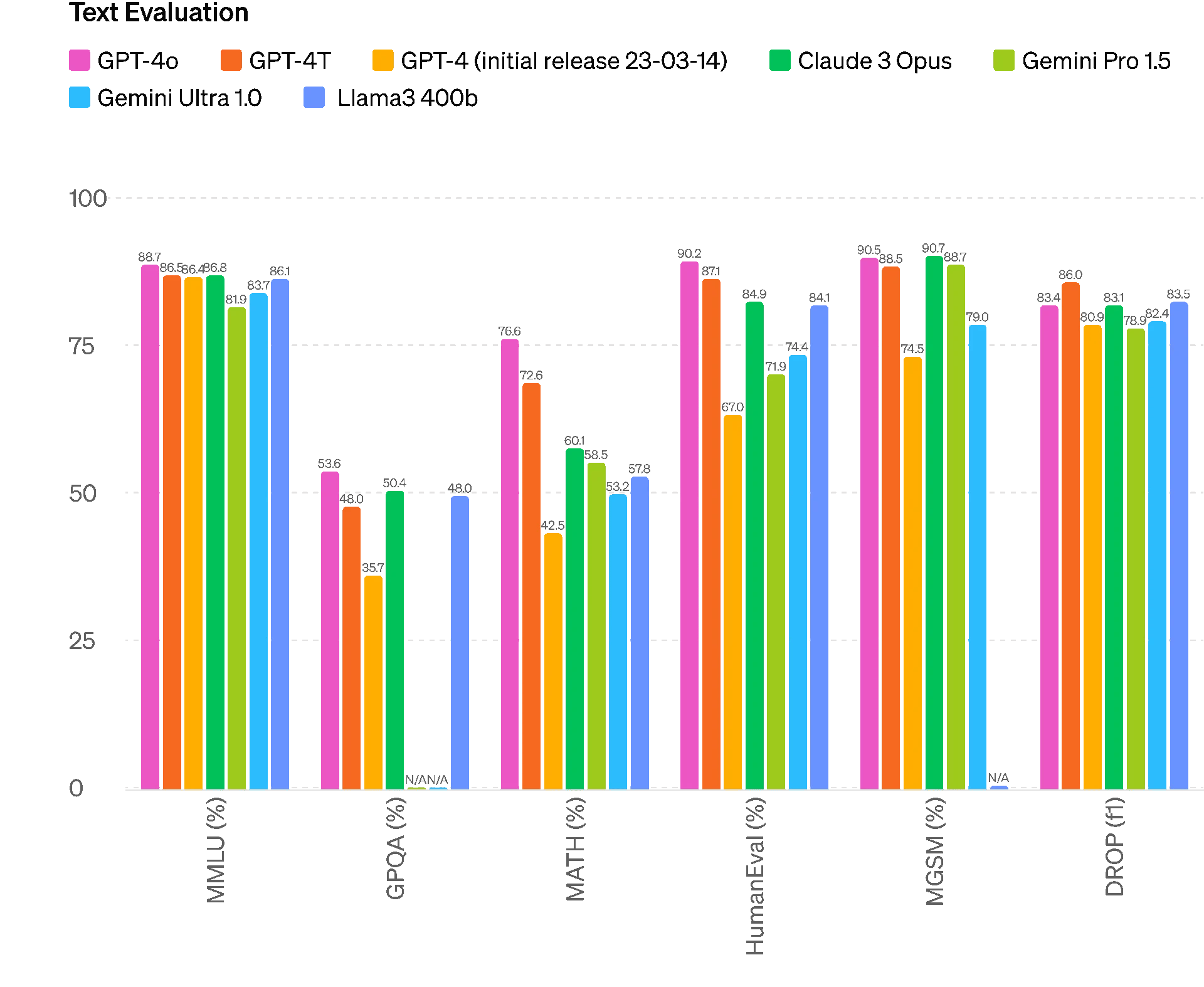 Alla luce di tutto questo, quando viene misurato su benchmark tradizionali, GPT-4o è in grado di raggiungere prestazioni di livello GPT-4 Turbo per quanto riguarda l’intelligenza testuale, il ragionamento e il codice, e in più stabilisce nuovi ed elevati parametri per quanto riguarda le capacità multilingue, audio e di computer vision.
