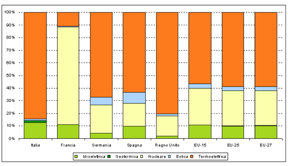 La quota di energie prodotte da Fer sul totale nell’ambito dell’Ue (v. tavola sotto) è ancora lontana, per molti paesi, dall’obiettivo posto dalle norme e intese comunitarie. Bisogna dire che i dati riportati nella tavola sotto, sono ancora riferiti al 2007, e non sono stati ancora pubblicati aggiornamenti sui confronti internazionali per gli anni 2008-9, nei quali, soprattutto in alcuni paesi (Italia, Spagna, Germania) e per alcune Fer (fotovoltaico, eolico) sono stati fatti grandi progressi. Il dato relativo all’Italia è comunque significativo. Ben oltre l’80% della produzione di energia deriva da centrali termoelettriche, alimentate da combustibili fossili, il 90% dei quali proviene dall’estero. In questi semplici dati si racchiudono le contraddizioni della nostra politica energetica, ed i vincoli che la nostra dipendenza dall’estero pone allo sviluppo economico del paese.