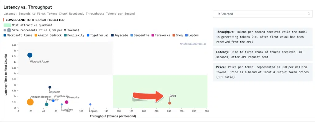 Groq, società specializzata in soluzioni di intelligenza artificiale generativa, è risultato il chiaro vincitore dell’ultimo benchmark sui modelli linguistici di grandi dimensioni (LLM) di ArtificialAnalysis.ai, battendo otto partecipanti in indicatori di prestazioni chiave, tra cui la latenza rispetto al throughput, il throughput nel tempo, il tempo di risposta totale e la varianza del throughput.