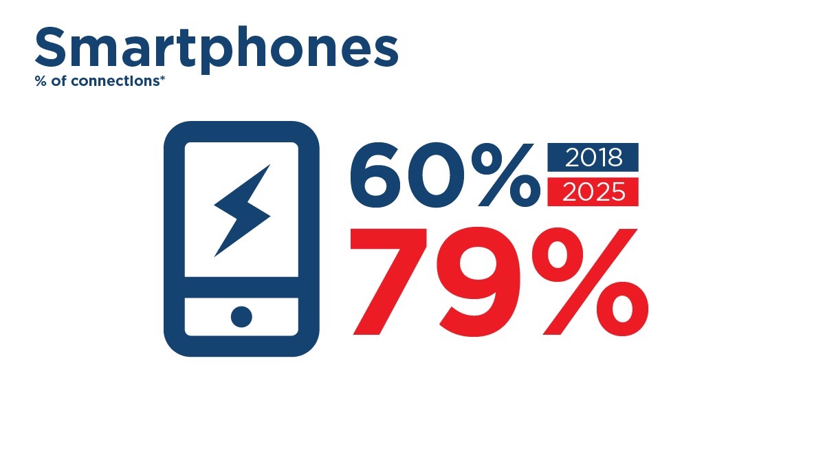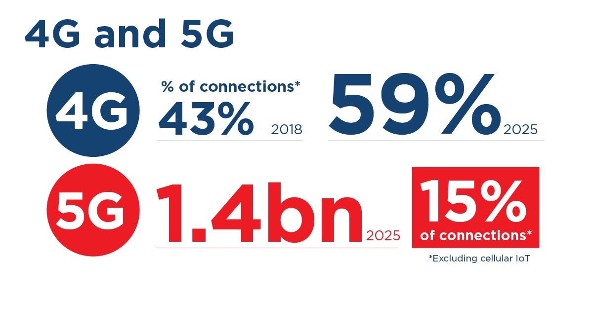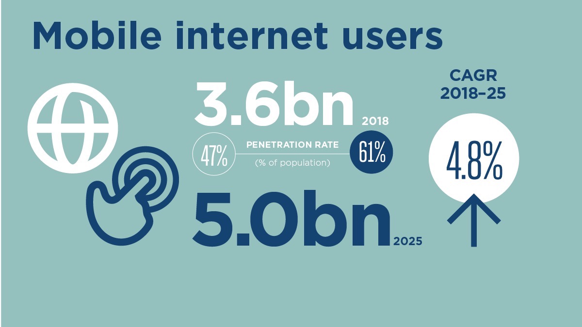 5GAltri 1,4 miliardi di persone inizieranno a utilizzare l’Internet mobile nei prossimi sette anni. Portando il numero totale di abbonati Internet mobili a 5 miliardi entro il 2025 (oltre il 60% della popolazione).