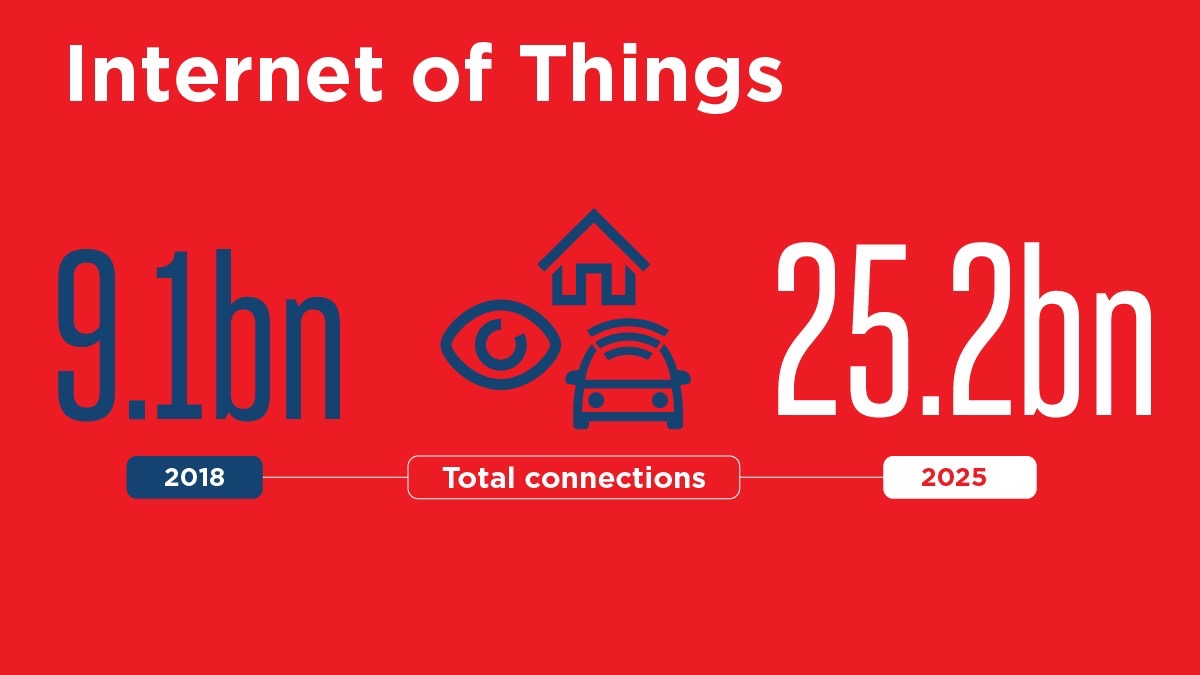 Il numero di connessioni IoT globali triplicherà fino a 25 miliardi entro il 2025. Mentre le revenue globali dell’IoT quadruplicheranno fino a 1,1 migliaia di miliardi di dollari.