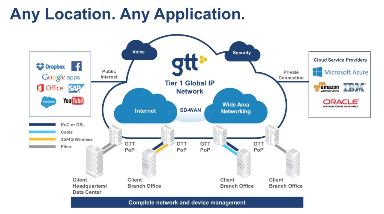 GTT Communications é un operatore globale nella fornitura di servizi di cloud networking, che offre un portfolio completo di servizi di rete, inclusi Sd Wan, wide area networking, Internet, trasporto e infrastruttura e managed services.