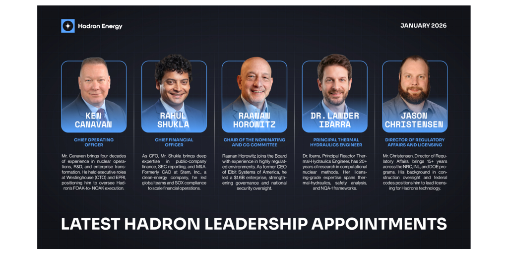 The appointments build on Hadron’s recent progress across NRC engagement, board formation, and its proposed $1.2 billion business combination with GigCapital7, reinforcing the Company’s position as a leading developer of light-water MMRs designed for near-term commercial deployment.