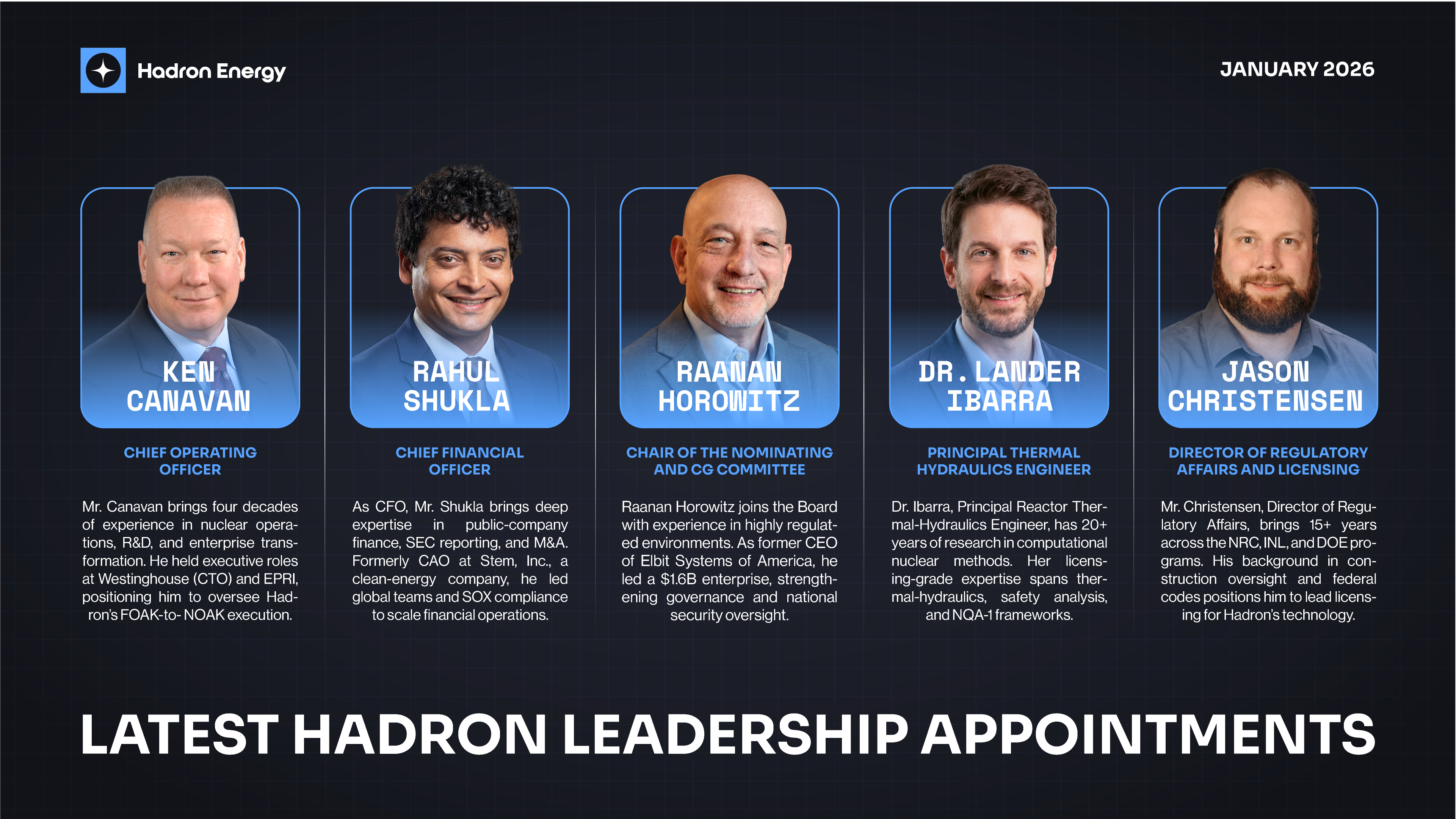 “These appointments collectively mark a major inflection point for Hadron,” said Samuel Gibson, Founder and Chief Executive Officer of Hadron. “Ken and Rahul anchor our operational and financial leadership as we move toward public markets, while Lander and Jason add world-class depth in licensing-grade engineering and regulatory execution. With Raanan joining Hadron’s announced post-closing Board with 8 total members led by Executive Chairman Dr. Avi Katz, Rannan further strengthens Hadron’s governance, national-security engagement, and long-term strategic positioning. Together, we hope this leadership team will significantly enhance our ability to deliver the Halo MMR safely, on schedule, and at scale.”