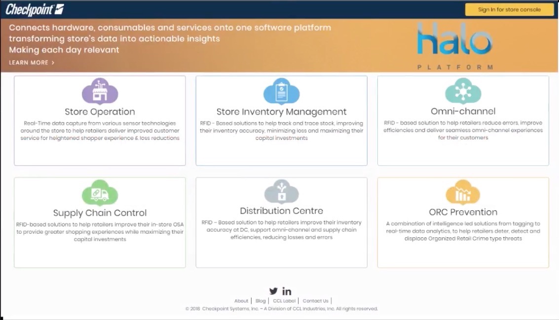 Checkpoint fornisce soluzioni verticalmente integrate per la prevenzione dei furti, la sorveglianza elettronica degli articoli, hardware IoT e i prodotti software. La piattaforma Halo è una soluzione intelligente per tracciare e proteggere tutti i prodotti.