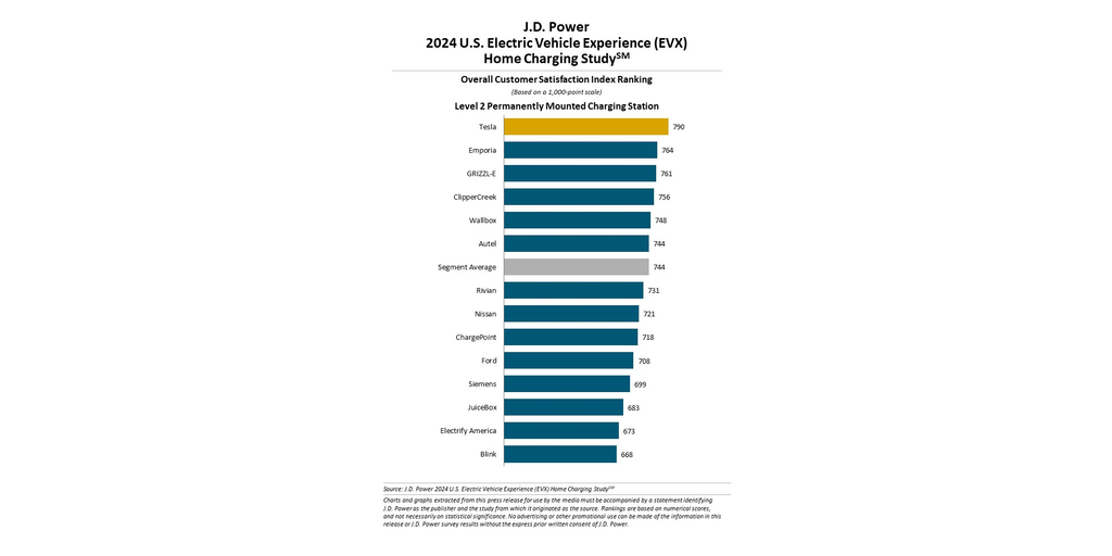 Tesla ranks highest among Level 2 permanently mounted charging stations for a fourth consecutive year, with a score of 790. Emporia (764) ranks second and GRIZZL-E (761) ranks third.