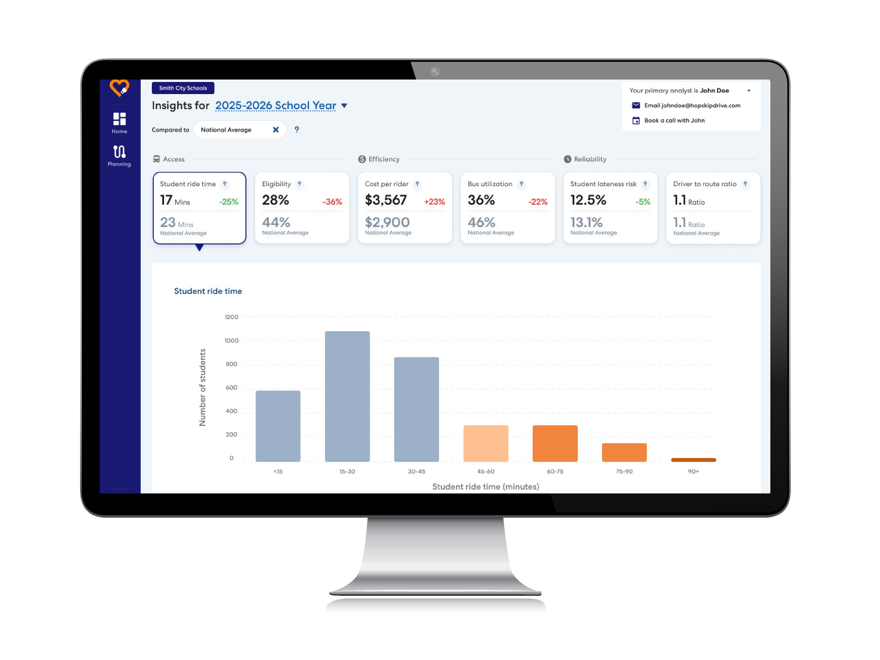 The new RouteWise AI dashboard gives district leadership insights into the metrics that matter, including student ride times, costs per rider, and bus utilization rates. Users can compare these metrics against national averages, allowing them to benchmark against peers and track improvements. HopSkipDrive's team of transportation and change management experts collaborate on the best transportation plan for each district that fit into existing routing software or platforms.