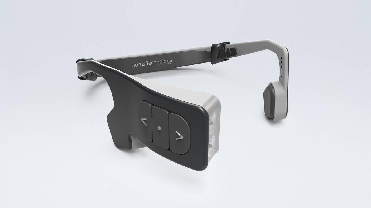 Dato vita a una primissima versione con telecamere montate su occhiali, la forma attualmente assunta da Horus, «che resta compatibile con qualsiasi montatura per occhiali», è quella di un paio di cuffie sportive che passano dietro la testa e sul cui lato destro sono