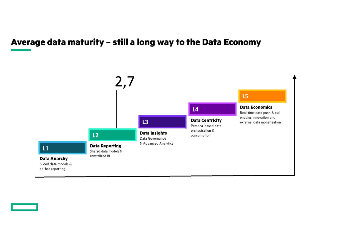 Il modello HPE prevede cinque livelli di maturità, di cui il livello 1 (la cosiddetta “anarchia dei dati”) è il più basso mentre il 5 (la “data economy”) è il più alto. In media, le aziende italiane intervistate hanno raggiunto un livello di maturità dei dati pari a 2,7: si trovano quindi al livello “data reporting”, in cui i dati vengono utilizzati principalmente per valutare retrospettivamente e periodicamente il successo delle attività aziendali (come i dati di vendita o la soddisfazione dei clienti). In questa fase, tuttavia, le aziende sono ancora lontane dal raggiungimento del livello più alto, in cui i dati interni ed esterni vengono sfruttati in modo strategico ed efficace per la creazione di valore (ad esempio, sotto forma di prodotti e servizi basati sui dati).